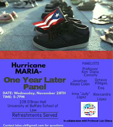 When I think about the connection that The University at Buffalo School of Law has with Puerto Rico, I feel grateful and proud that I chose to attend UB. UB Law has an entire clinic committed exclusively to serving victims of Hurricane Maria; a class on insurance law, with a focus on Hurricane Maria, taught by the Dean of the Law School who is also an insurance expert, Dean Aviva Abramovsky; several students of Puerto Rican descent, including a student born and raised in Puerto Rico; and a professor from Puerto Rico, Professor Luis Chiesa. Considering the school’s involvement in the post Hurricane Maria relief effort, it felt natural when Professor Chiesa approached the Latin American Students Association (LALSA) to plan a panel discussing how Puerto Rico was doing a year later after Hurricane Maria. As both the Co-President of LALSA and a student attorney for UB’s Puerto Rico Recovery Assistance Legal Clinic, it also felt natural to step into the role of planning this event.