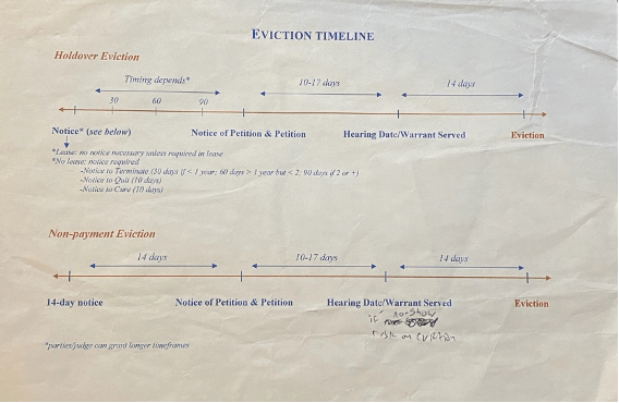I was assigned a cubicle, as depicted in my photo, and would work on a variety of tasks. One of the most common tasks was to call clients to explain the eviction timelines. The timelines are depicted in the graphic provided to me by the Housing Unit. A lot of clients who called believed they had a few days before an eviction. One of my responsibilities was to call those clients and explain how much time the client realistically had. These calls often consisted of a variety of emotions. Most of the time clients would be relieved that they had a few weeks to prepare for an eviction, instead of a few days. On the other hand, clients would be upset to learn New York was not a good cause eviction state. This means landlords can initiate holdover evictions against their tenants for “really any reason they want,” according to my supervisor.